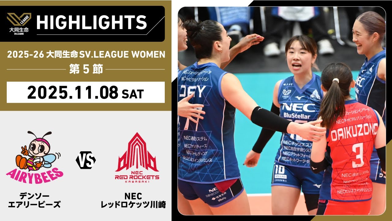 - タイトル: 【2025/11/08 ハイライト】2025-26 大同生命SV.LEAGUE WOMEN 第5節 GAME1 デンソー vs NEC川崎