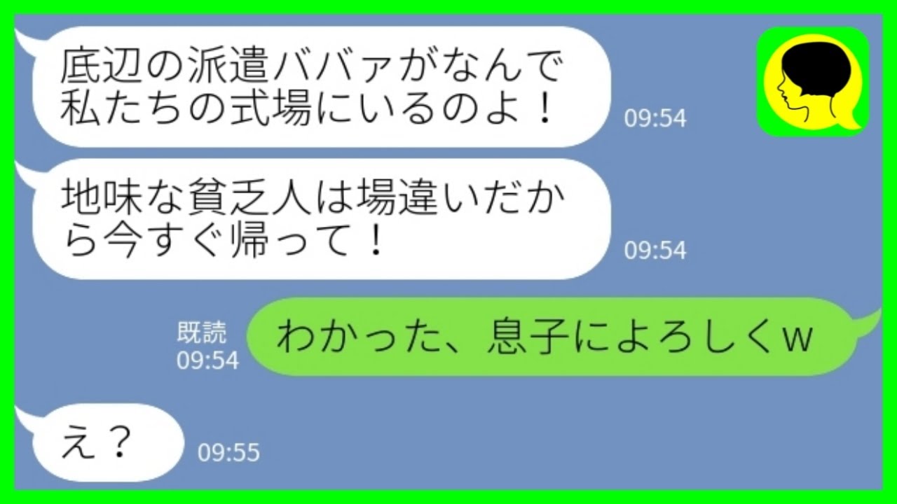 【LINE】息子夫婦の結婚式で私が新郎の母と知らずに追い返した新婦「貧乏くさいババァは今すぐ帰れ!」私「わかったわ、息子によろしくw」→颯爽と帰宅した結果www スカッとするライン動画配信中です!