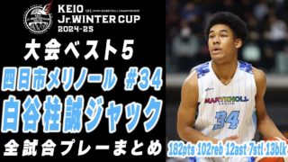 バスケットボール【大会ベスト5】白谷柱誠ジャック 京王 Jr.ウインターカップ2024-25 全試合プレーまとめ (四日市メリノール #34 | 3年)【バスケ】 京王Jr.ウインターカップ2024-25で大会史上最多の182得点を記録し大会ベスト5に輝いた白谷柱誠ジャック選手(四日市メリノール学院中学校/3年)のプレーをまとめました!0:00 vs. MEIHO EAGLES (2回戦) └19pt... 2025.01.12バスケットボール