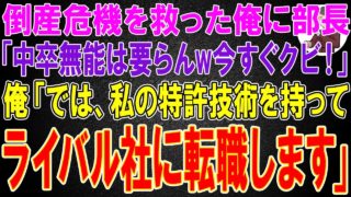 【スカッと】業界初の特許技術を開発し倒産危機を救った俺に部長「中卒無能は要らんw今すぐクビ!」俺「では、私の特許技術を持ってライバル社に転職します」