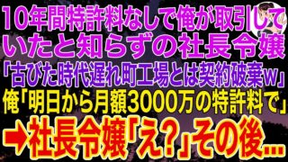 【スカッとする話】10年間特許料なしで俺が取引したと知らずの社長令嬢「古びた時代遅れの町工場との契約破棄!2度と顔見せるなw」俺「明日から月額3000万の特許料よろしく」社長令嬢「え?」その後…
