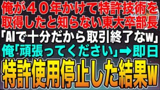 特許【感動する話】俺の特許技術で会社が成り立っていると知らない取引先の東大卒部長「AI技術で代用できるから契約終了で」俺「了解です」➡︎即日特許使用停止して結果w【スカッと】【朗読】 # 感動秘話:特許技術で会社を設立!成功の裏側と未来への展望## 導入:夢を形にした感動の物語「不可能」を「可能」に変える。一人の技術者の情熱と革新的な特許技術が、いかにして会社設立という夢を実現させたのか。本記事では、その感動的な軌跡を辿... 2025.08.09特許