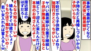 【漫画】私「娘を高卒でスナック嬢にする気はない!帰れ!」事故で義弟が亡くなり義弟嫁が子供を要らないと言い出した→不妊だった私達が養子縁組し義弟嫁に接近禁止を命じたが…(スカッと漫画)【マンガ動画】