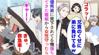 【漫画】幼い頃から優秀な弟に見下されてきた俺。ある日、弟に無視されながら買い物に行くと、上から看板が落ちてきた「逃げて!」→咄嗟に近くにいた女の子を助けたら【マンガ動画】