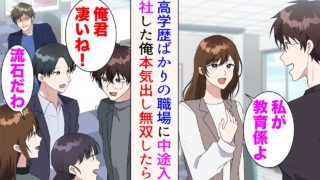 【漫画】高学歴ばかりの職場に中途入社した俺。美人先輩「私が教育係よ」→「なんで低学歴が…」それが気に食わない嫌味先輩は俺に嫉妬。さらに、俺が無双すると…【マンガ動画】