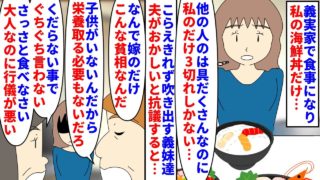 【漫画】私「トロ…サーモン…ウニ…甘エビ…イクラ…カニ…」義実家で食事になり私の海鮮丼だけ刺し身が3切れだけ→他の人は具だくさんで豪華なので夫が抗議すると意地汚い嫁扱い(スカッと漫画)【マンガ動画】