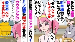 【漫画】会社の移転に伴い近くの駐車場を借りて車通勤になったら同僚「駐車場シェアしよ♥」私「なにそれ聞いたことないし怖いしやめとく」→それから同僚に睨まれるようになったがある日突然辞めたかと思ったら…