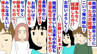 【漫画】祖母「全部妹にやらせて礼もなし?」兄「うざw」両親の法事で数年ぶりに兄と再会→知らない間に結婚していて親戚付き合いも私に全任せでお祝いだけねだりに来て…(スカッと漫画)【マンガ動画】