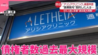 脱毛【医療脱毛大手】「アリシアクリニック」突然の破産申請 契約した人は…【脱毛】 医療脱毛大手「アリシアクリニック」の運営会社が自己破産を申請しました。債権者は9万人以上にのぼり、過去最大規模となっています。利用者のもとには、クリニックからメッセージが届いていました。この動画の記事を読む> ◇10日、東京・吉祥寺では... 2024.12.11脱毛